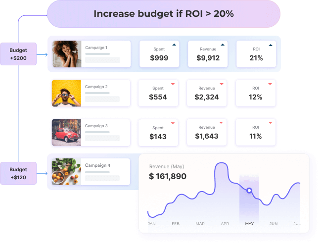 Get peace of mind knowing that Taboola campaigns, ads or publishers with low conversions will be automatically blocked. Increase bids or budgets for campaigns with high ROIs.